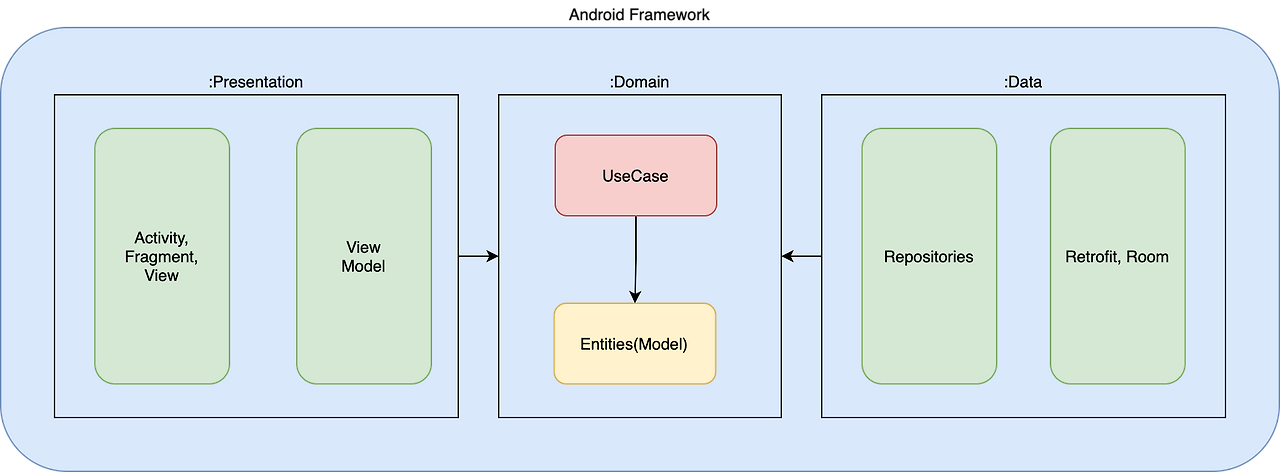 그러면 우리가 익히 알고있는 구글의 앱 아키텍처와 구성이 달라지게 된다. 위의 그림에서 화살표 방향을 보면 데이터 레이어가 도메인 레이어에 의존적이다. 이는 앱 아키텍처에서 데이터 레이어에 들어가야할 엔티티가 도메인 레이어로 들어가버리기 때문인데 이 부분에서 구글의 앱 아키텍처와 클린 아키텍처의 가장 큰 차이점이 발생하게 된다.