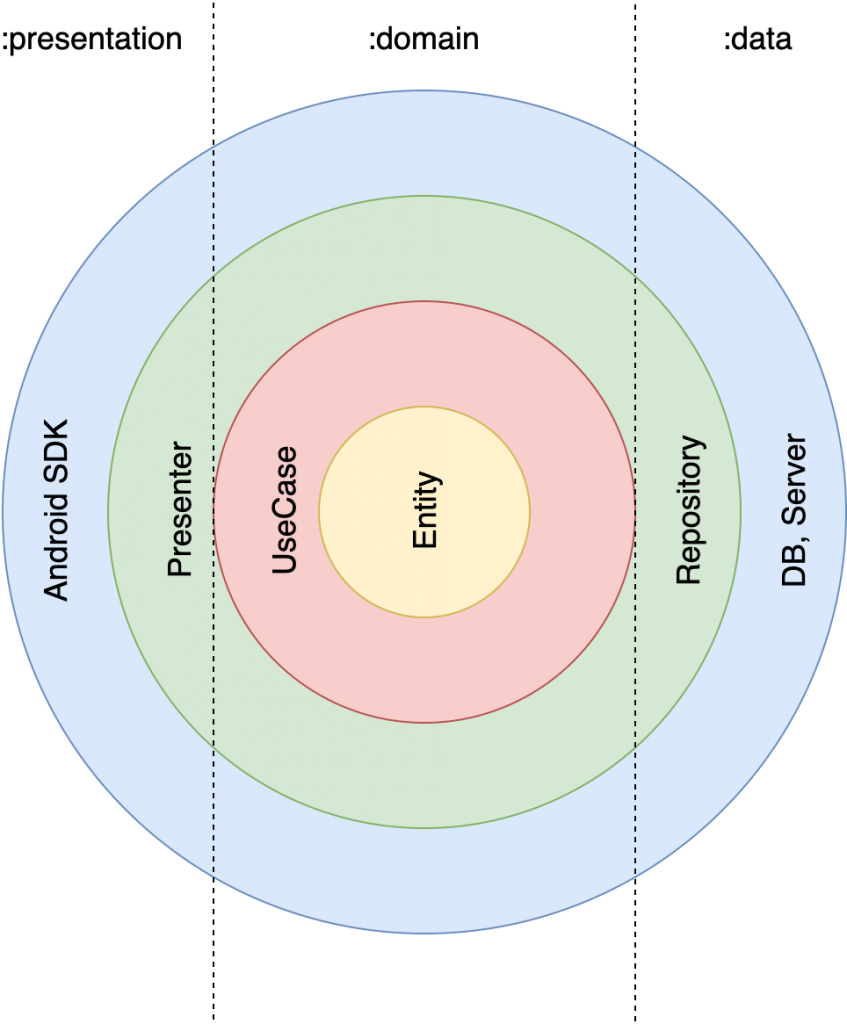 위의 그림은 클린아키텍처와 앱 아키텍처를 혼합한 모습이다. 이렇게 보니 동심원상으로 프레젠터와 레포지토리, sdk와 디비&서버가 같은 선상에 있어서 약간 이해가 어렵기 때문에